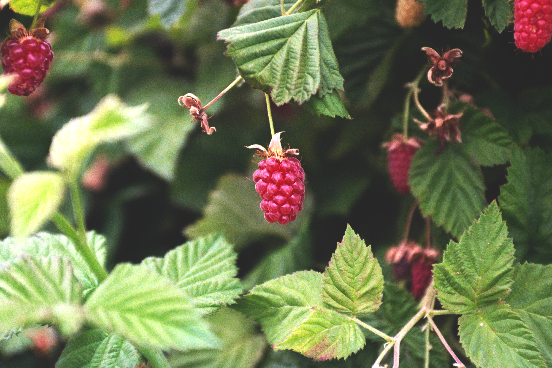 raspberry Ripe raspberry hanging from a leafy green vine photographed by Seattle fine art photographer Ashley Brooke Twomey