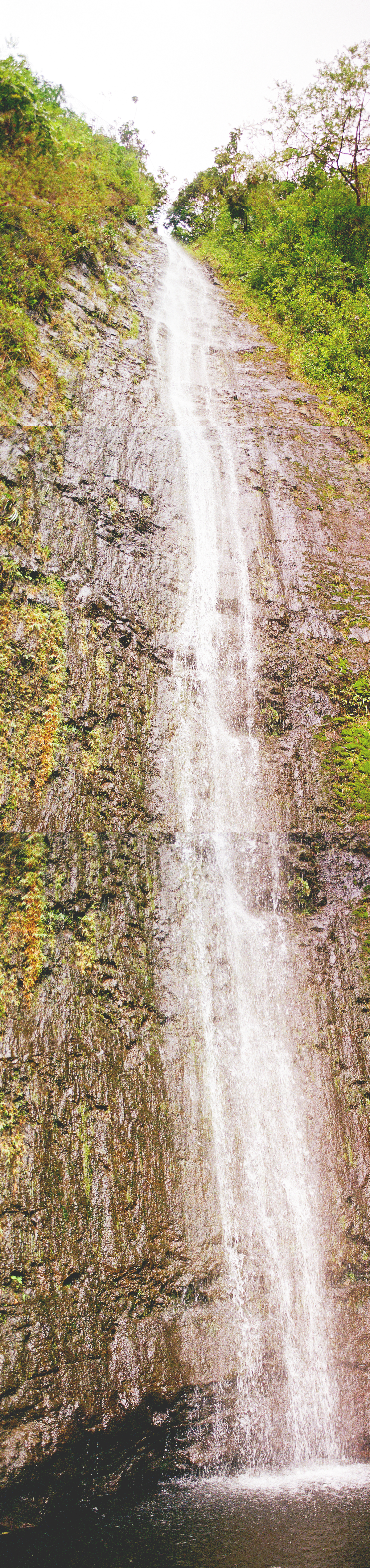 Waterfall cascading down moss-covered cliffs in Kauai captured by Seattle fine art photographer Ashley Brooke Twomey