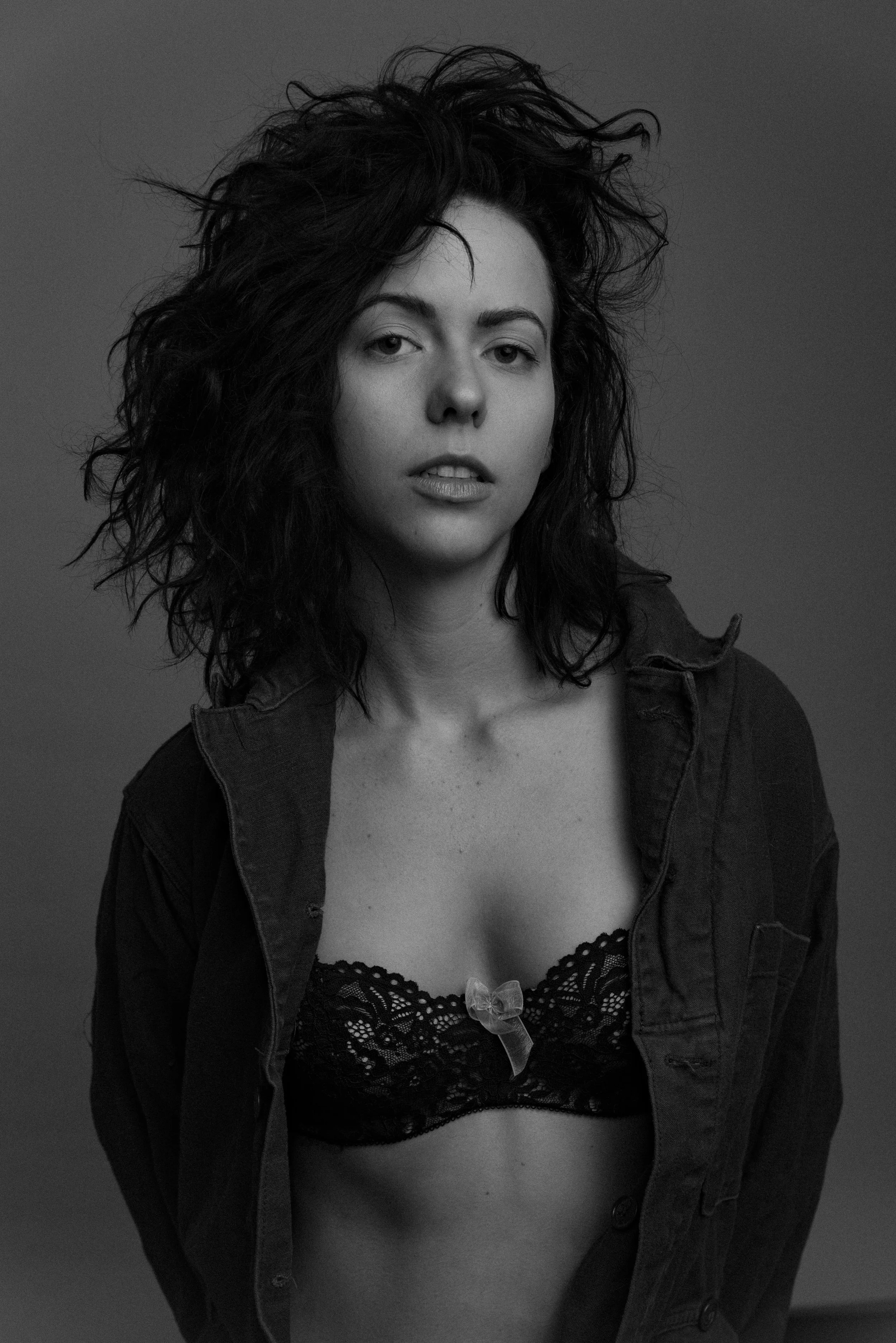 Black and white portrait of a woman with messy, curly hair, wearing a lace bra and an unbuttoned denim jacket, looking directly at the camera.