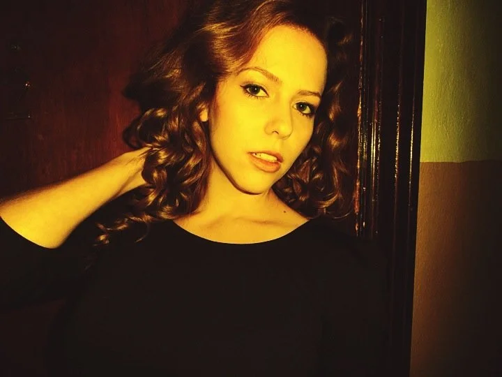 A young woman with curly hair and light skin posing indoors, wearing a black top, with her hand behind her head, looking at the camera with a confident expression.